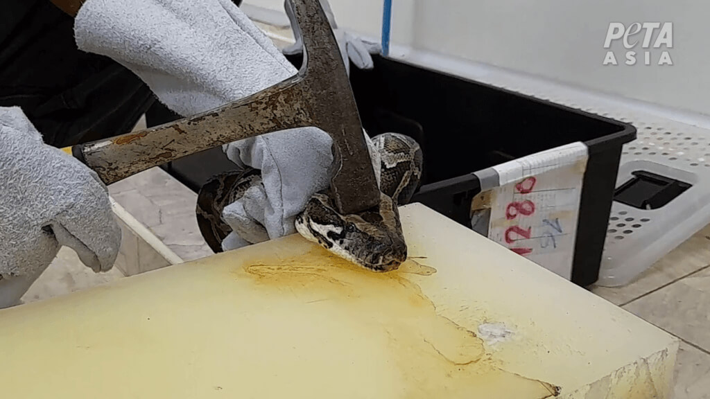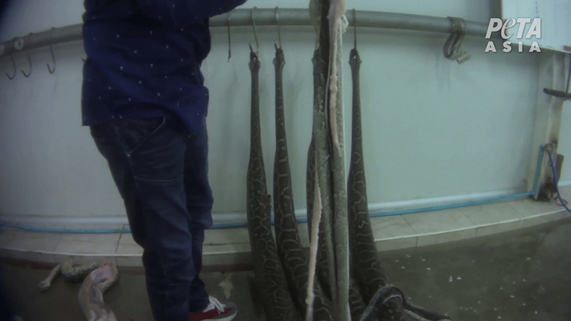 The investigators recorded workers pinning down struggling pythons by the neck, bashing them over the head with a hammer, and driving metal hooks through their heads. 😰 Workers even inflate the snakes with water to make their skins easier to remove—even though the snakes continued to move during the process. Dr. Clifford Warwick, a reptile expert who saw the vid, confirmed that most of the animals were prob conscious during this excruciating process. 😭 Then the snakes were skinned.