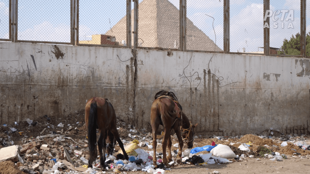 PETA investigators went behind the wall of the ticketed tourist area at the pyramids and found dead bodies of horses dumped in the trash every single day. 😱 They also found the dead body of a camel. Just steps away from these rotting bodies, malnourished horses were eating food from piles of trash. One time, investigators found a horse who was barely alive and had been left to die in agonizing pain. 😓