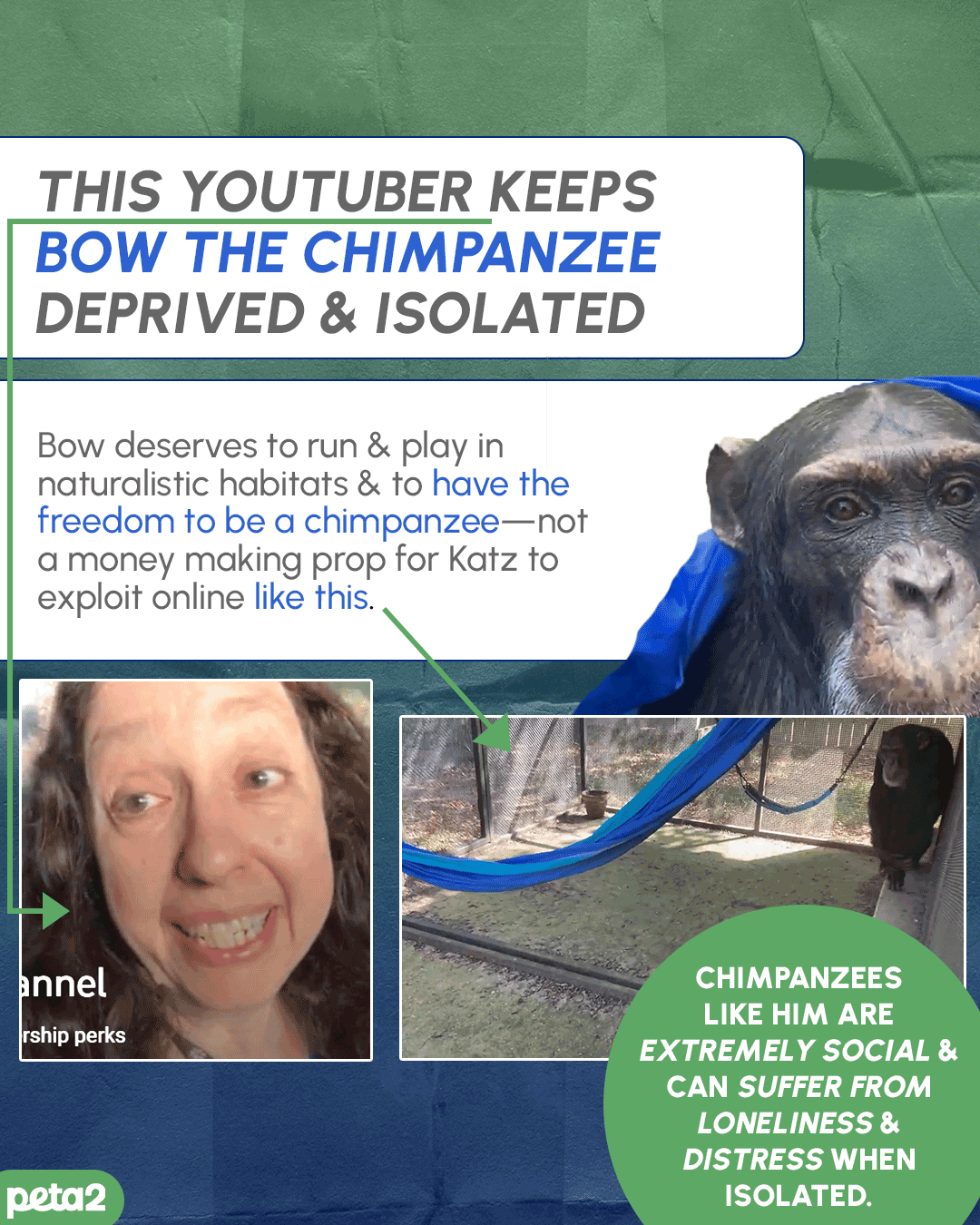 Not only does Katz force Bow to live in a barren cage with no other chimpanzee companionship, she also knowingly defies federal law. Even though the Animal Welfare Act requires that online exhibitors keep a federal license from the U.S. Department of Agriculture, Katz has refused to get a license or let federal authorities inspect Bow and the conditions she keeps him in. 😒